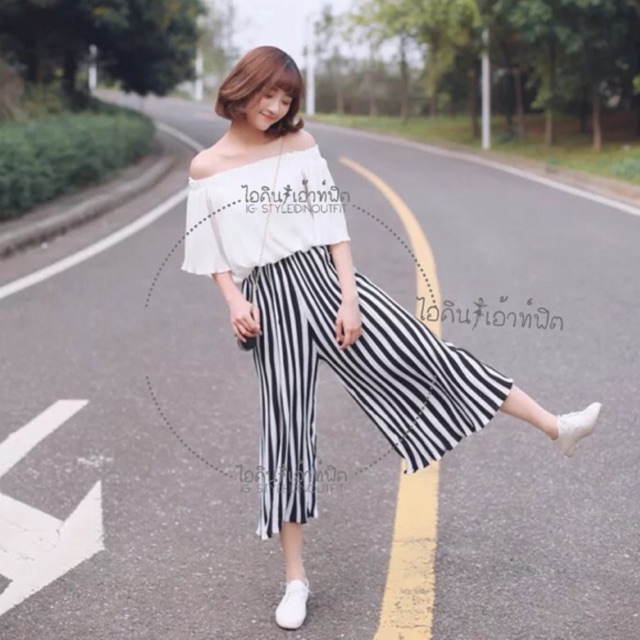 Product Details กางเกง 5 ส่วน พลีทชายบานพริ้ว ขาวดำ ตามแบบ รหัส ibb