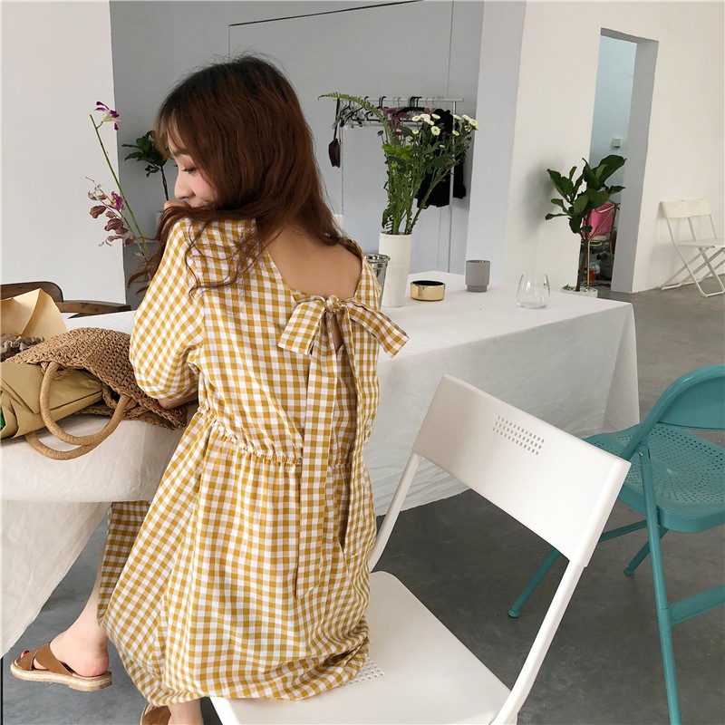 ขาย Sale+พร้อมส่ง Yellow bowwy back dress ชุดเดรสสั้นลายสก็อตสีเหลือง ผูกโบว์หลังบน สไตล์เกาหลี น่าร ราคาถูกส่งฟรีทั่วประเทศ